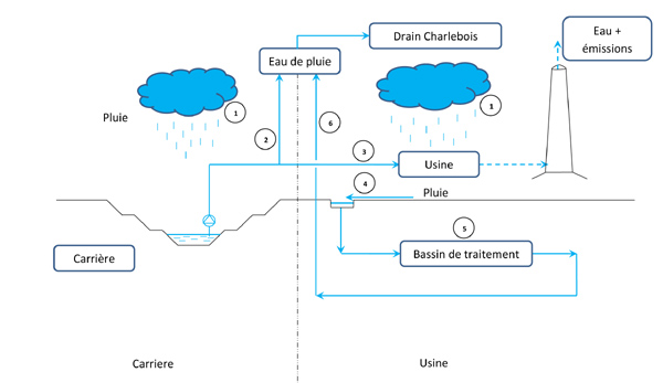 • Le combustible (coke de pétrole) sera entreposé sur une dalle de béton. Les eaux de ruissellement seront recueillies dans un puisard et traitées avant d’être utilisées dans le procédé. Cette eau ne sera pas rejetée vers le ‘Drain Charlebois’.
