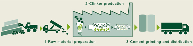 Step 1 - Raw material preparation Limestone and silica sand are blended with additional minerals into a finely ground powder. Step 2 - Clinker production The finely ground powder is heated in a kiln producing a molten product called clinker. Step 3 - Cement grinding and distribution The clinker is mixed with additional materials, depending on the type of cement being made, then ground to a fine powder. |